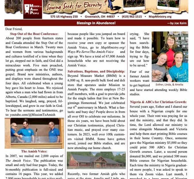 April 2024 IN THIS ISSUE: Blessings in Abundance Blessings in Abundance Step Out of the Boat Conference About 200 people from fourteen states and Canada attended the Step Out of the Boat Conference in…