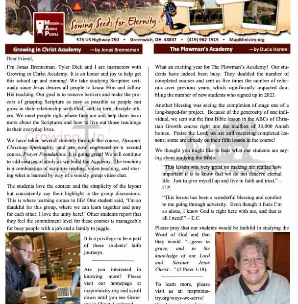 February 2024 IN THIS ISSUE: Growing in Christ Academy The Plowman’s Academy New Beginnings Homestead Growing in Christ Academy I’m Jonas Brenneman. Tyler Dick and I are instructors with Growing in Christ Academy. It is…
