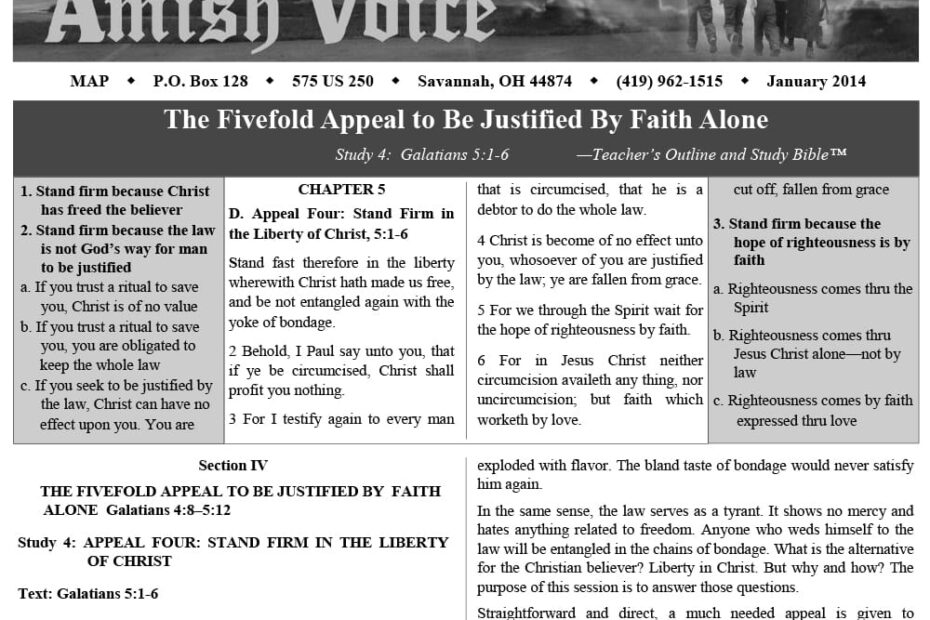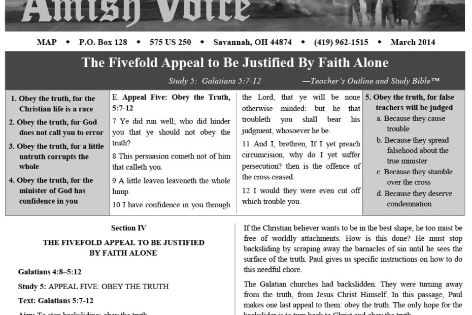 Amish Voice – March 2014 IN THIS ISSUE: The Fivefold Appeal to Be Justified by Faith Alone Missionaries – Eli Stutzman Conference Calls! Crushed Down, But Not Destroyed – Lynn Miller Martin Luther’s Conversion – Horatius Bonar (1808-1889)…