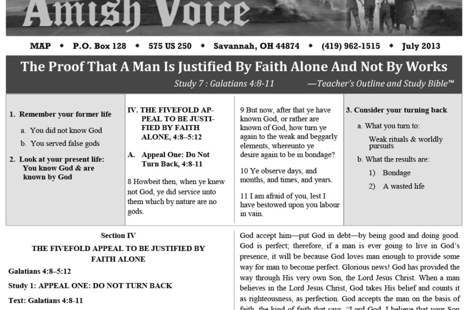 Amish Voice – July 2013 IN THIS ISSUE: The Proof That Man is Justified by Faith Alone and Not By Works Offensive Love – Marvin Hershberger The Family – Paul Miller God is Our Provider – Lynn Miller…