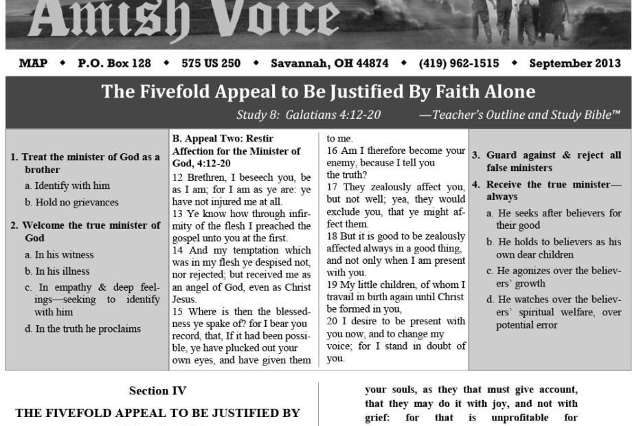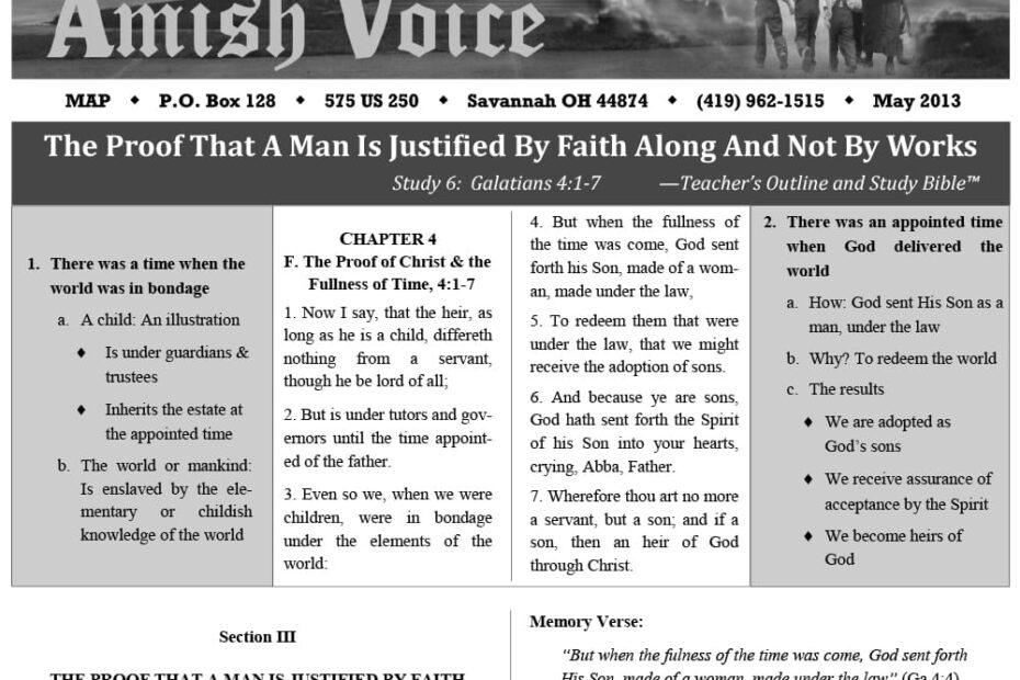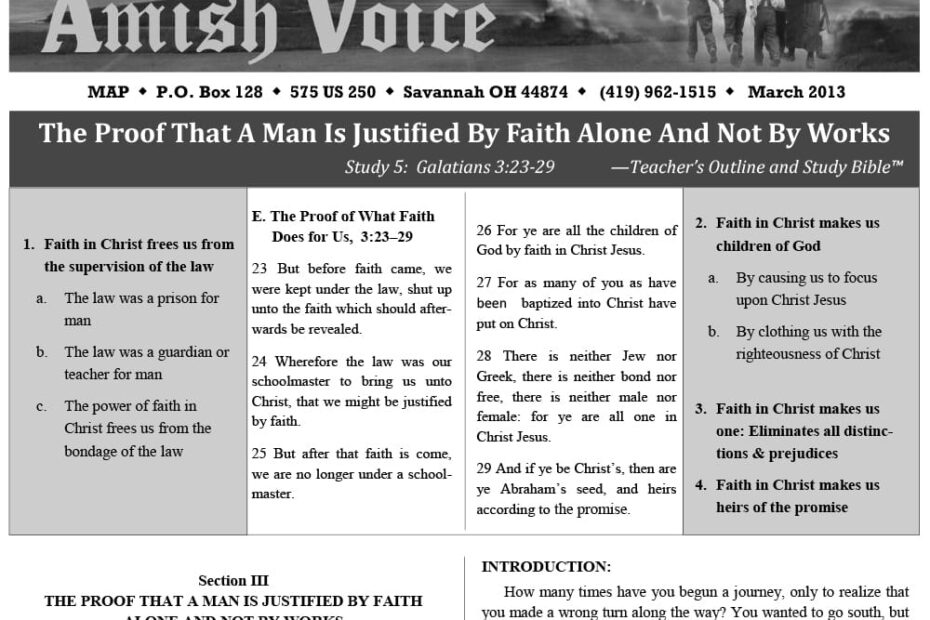 Amish Voice – March 2013 IN THIS ISSUE: The Proof That Man is Justified by Faith Alone and Not By Works Preachers Outline & Sermon Bible in King James Version Seasons and Times – Lynn Miller…