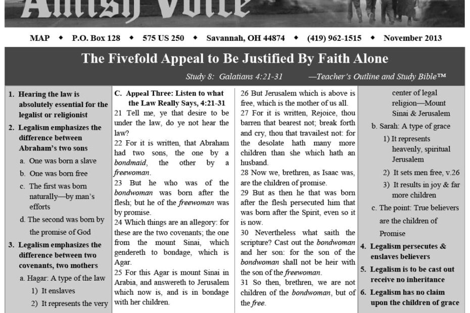 Amish Voice – November 2013 IN THIS ISSUE: The Fivefold Appeal to Be Justified by Faith Alone The Journey of Life – Lynn Miller Multitudes, Multitudes in the Valley of Decision – Ben Girod The Dream –…