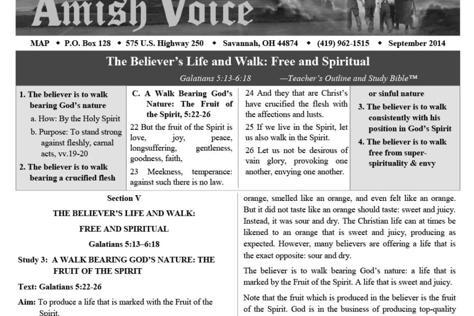 Amish Voice – September 2014 IN THIS ISSUE: Family Leadership – Lynn Miller Free Bible Correspondence Courses! Conference Calls! It’s His Nature – Eli Stutzman Christianity: Faith or By Sight? – Joe Keim