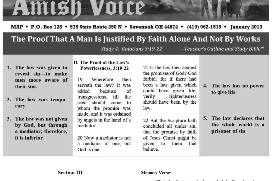Amish Voice – January 2013 IN THIS ISSUE: The Proof That Man is Justified by Faith Alone and Not By Works Overwhelmed – Dr. Fred Childs Born Again – My Journey to Salvation – Jonas Yoder…