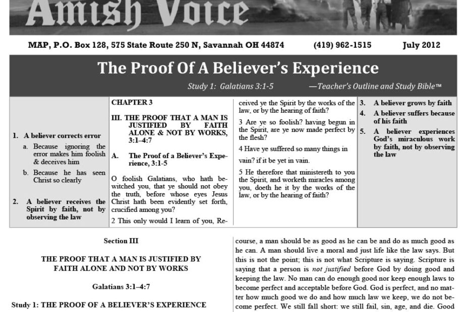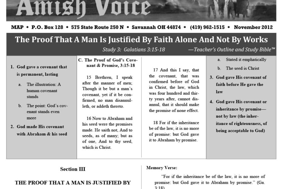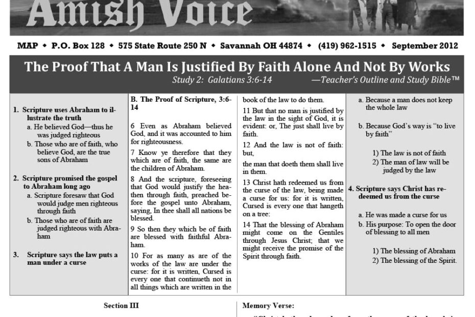 Amish Voice – September 2012 IN THIS ISSUE: The Proof That Man is Justified by Faith Alone and Not By Works A Father’s Blessing – Jonathan Helmuth The Two Covenants – Eli Stutzman Separation from…