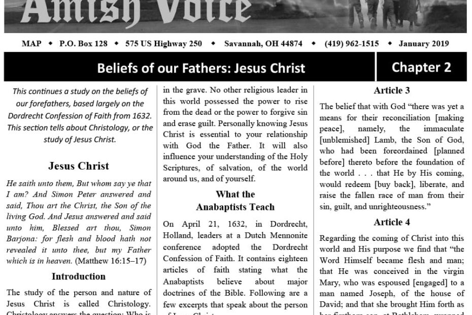 Amish Voice – January 2019 IN THIS ISSUE: Beliefs of Our Fathers: Jesus Christ (Chapter 2) How Much? – Ann Detweiler My Safe Place – Norma Miller Legalism – Worse Than Adultery – John Weaver Sermons and Testimonies… Amish Voice – January 2019