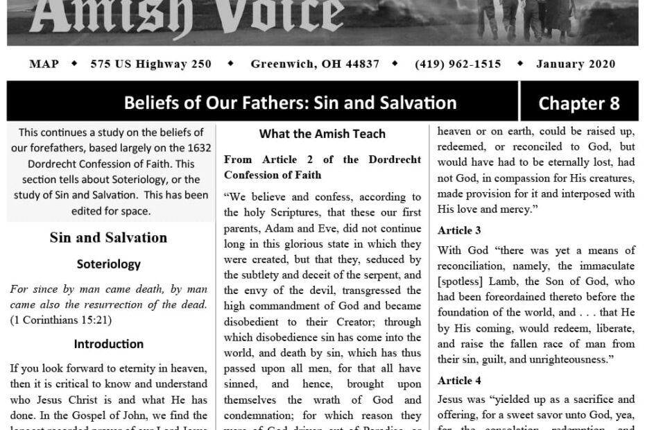 Amish Voice – January 2020 IN THIS ISSUE: Beliefs of Our Fathers: Sin and Salvation (Chapter 8) Feedback and Response Sanctified in Truth – Ben Girod The Root Cause of Anxiety – Eli Lee Should… Amish Voice – January 2020