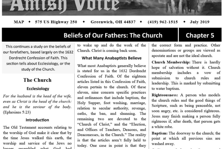 Amish Voice – July 2019 IN THIS ISSUE: Beliefs of Our Fathers: The Church (Chapter 5) Feedback and Response Section What Does it Mean to “Ask Jesus into your Heart”? Sermons and Testimonies over the… Amish Voice – July 2019