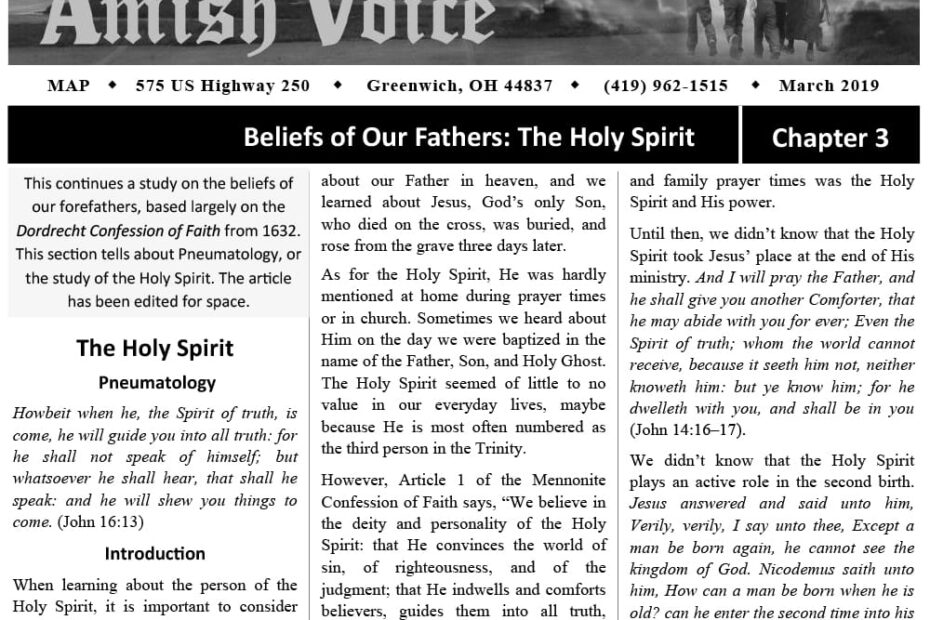 Amish Voice – March 2019 IN THIS ISSUE: Beliefs of Our Fathers: The Holy Spirit (Chapter 3) The Battle – Dale Schmucker Treasure Your Wife – John Weaver Lemons – Grace Sermons and Testimonies over the Phone The… Amish Voice – March 2019