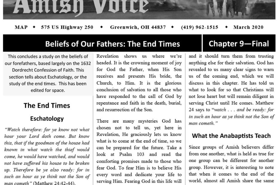 Amish Voice – March 2020 IN THIS ISSUE: Beliefs of Our Fathers: Sin and Salvation (Chapter 9 – Final) Feedback and Response Unlimited Slices of Pie – Norma Miller Does God Care if I Vote?… Amish Voice – March 2020