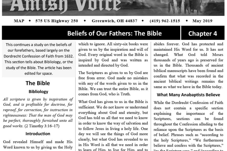 Amish Voice – May 2019 IN THIS ISSUE: Beliefs of Our Fathers: The Bible (Chapter 4) The Believer’s Benefits – Sylvan Lapp The Inner Battle – Joe Keim To my Dear Mother – Ann Detweiler Peachey Yes, I… Amish Voice – May 2019