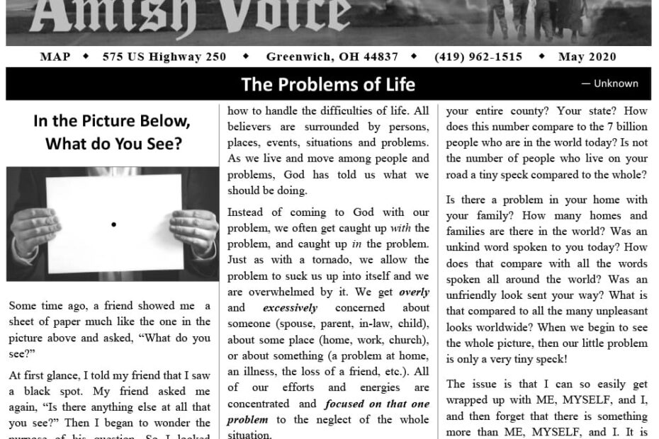 Amish Voice – May 2020 IN THIS ISSUE: The Problems of Life – Unknown God Has a Gift for You! – Joe Keim Consider – Ann Peachey Detweiler I Was Sexually Abused – Sarah Feedback and Response The… Amish Voice – May 2020