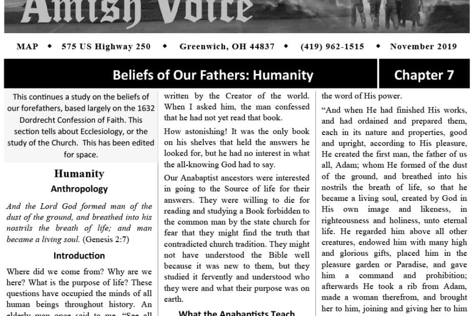 Amish Voice – November 2019 IN THIS ISSUE: Beliefs of Our Fathers: Humanity (Chapter 7) Perfect Little Angels or Abundantly Redeemed Children – Ann Peachey Detweiler Feedback and Response Section Should We Vote? – Billy… Amish Voice – November 2019