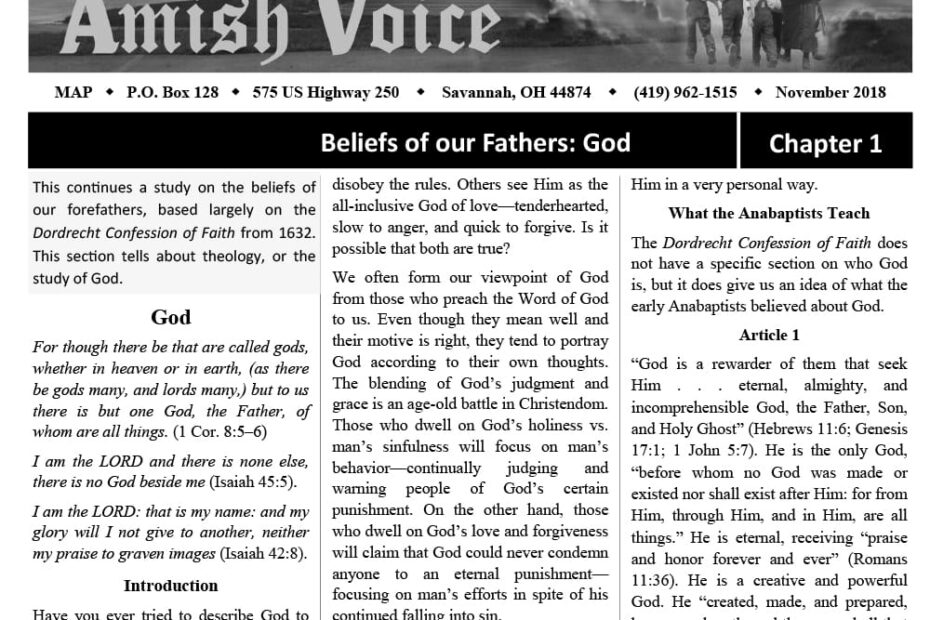 Amish Voice – November 2018 IN THIS ISSUE: Beliefs of our Fathers: God (Chapter 1) Desperation Births the Beautiful – Norma Miller Original Mandate – Joe Keim God is Perfect, but He’s Not a Perfectionist –… Amish Voice – November 2018