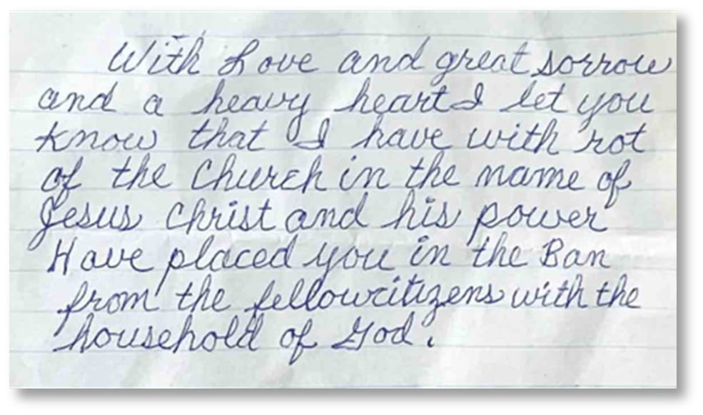 The following letter was written by Alan’s bishop and handed to him right after the business was transferred out of his name. What is so troublesome, is that church leaders justify turning a member over to Satan and splitting up a marriage and family all because of someone claiming assurance of salvation. In the process, they use God’s Word such as in the example at the right.