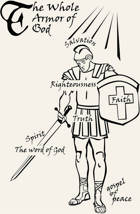 Finally, my brethren, be strong in the Lord, and in the power of his might. Put on the whole armour of God, that ye may be able to stand against the wiles of the devil. For we wrestle not against flesh and blood, but against principalities, against powers, against the rulers of the darkness of this world, against spiritual wickedness in high places. Wherefore take unto you the whole armour of God, that ye may be able to withstand in the evil day, and having done all, to stand. Stand therefore, having your loins girt about with truth, and having on the breastplate of righteousness; and your feet shod with the preparation of the gospel of peace; above all, taking the shield of faith, wherewith ye shall be able to quench all the fiery darts of the wicked. And take the helmet of salvation, and the sword of the Spirit, which is the word of God: praying always with all prayer and supplication in the Spirit, and watching thereunto with all perseverance and supplication for all saints (Ephesians 6:10-18)