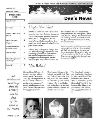 In This Issue: 1. Happy New Year To Read This Issue: CLICK HERE Notice Former Amish!!!!!!! Dee Yoder wants to hear from you! Please send her news about your former Amish community. Example: Deer hunting, babies, special accomplishes and events, such as reunions and graduations, etc. Don't forget the photos! To email Dee, click the clicker >>> RIGHT HERE |