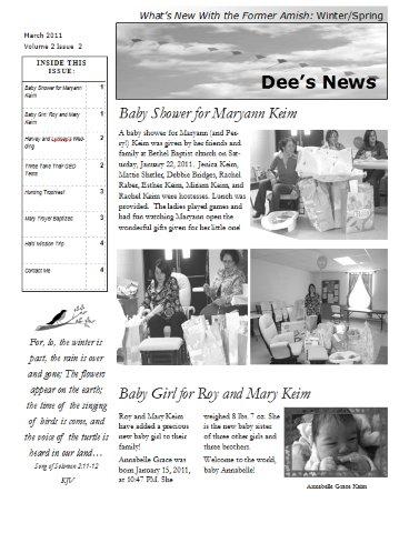 In This Issue: 1. Babies, Babies, Babies! How We Love Them.... To Read This Issue: CLICK HERE Notice Former Amish!!!!!!! Dee Yoder wants to hear from you! Please send her news about your former Amish community. Example: Deer hunting, babies, special accomplishes and events, such as reunions and graduations, etc. Don't forget the photos! To email Dee, click the clicker >>> RIGHT HERE |