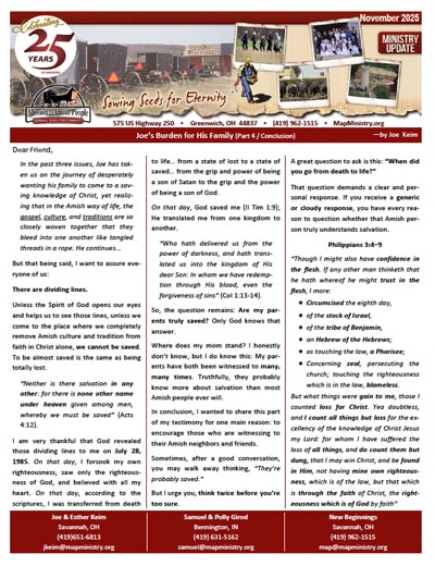 This newsletter update goes out every month. Our goal is to keep people up-to-date on all the things that are happening at Mission to Amish People. Since 2000, we have posted every issue on this website. Please feel free to browse and see what the Lord is doing among the Amish culture.