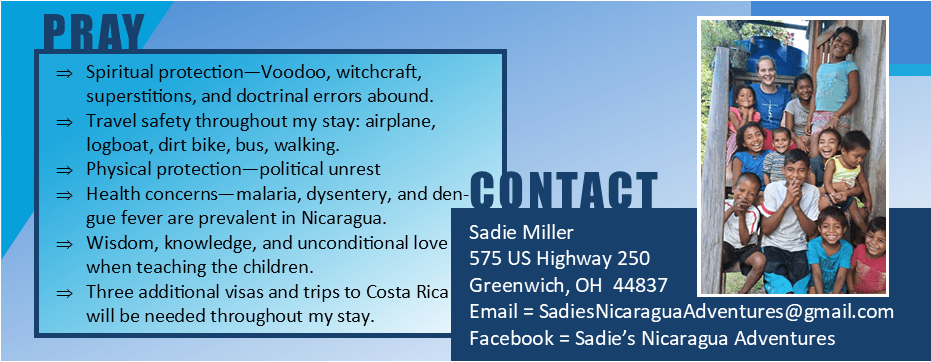 There is a need for someone to step into a children’s ministry role. For a long time, I have felt called to minister to children. Upon continued prayer, I am confident that God is leading me to serve children in this Nicaraguan village. Despite the anxiety of leaving friends, family, and familiar environments, I still think of those in Nicaragua and desire to reach them with the love of Jesus and the great news of the gospel.